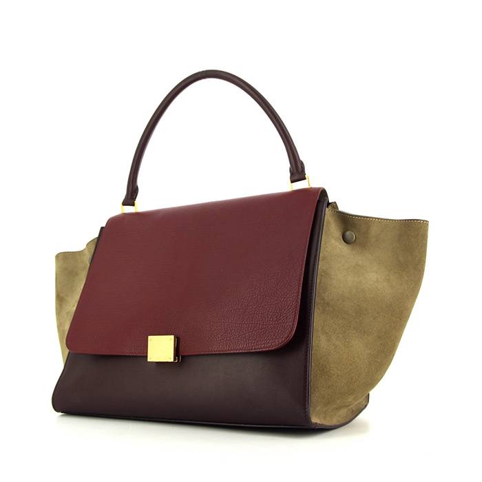 Excepcional bolso Celine Trapeze modelo grande de cuero color burdeos y morado y de ante beige, adorno en metal dorado, asa sencilla de cuero morado para llevar en la mano o al hombro.