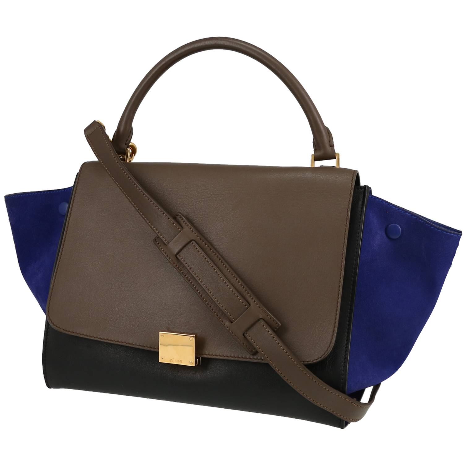 Inconfundible bolso de mano Celine Trapeze de cuero color topo y negro y ante azul, adorno en metal dorado, asa sencilla de cuero color topo, asa extraíble de cuero negro, bandolera extraíble de cuero color topo para llevar en la mano o al hombro.