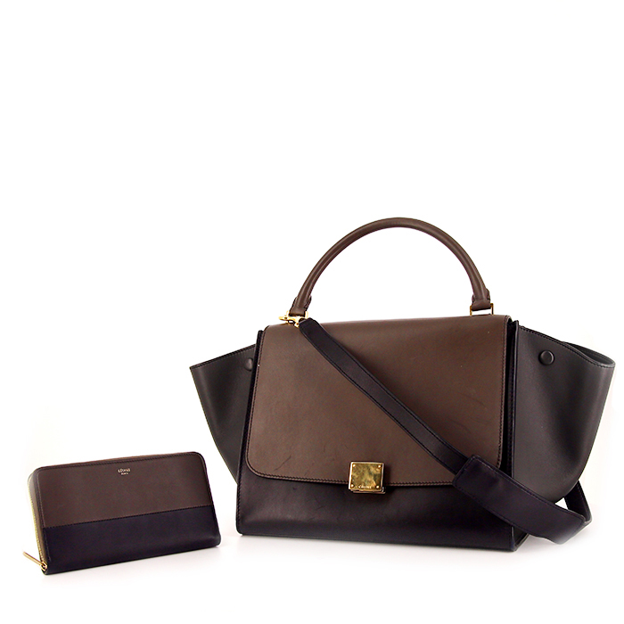 Magnífico bolso de mano Celine Trapeze de cuero marrón, gris y azul oscuro, adorno en metal dorado, asa sencilla de cuero marrón, bandolera extraíble de cuero azul oscuro para llevar en la mano o al hombro.