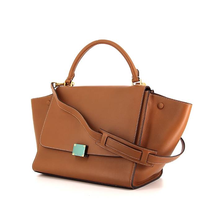 Elegante bolso de mano Celine Trapeze modelo mediano de cuero color camel, adorno en metal dorado, sobrecosturas color crema, asa sencilla de cuero color camel, bandolera extraíble de cuero color camel para llevar en la mano o al hombro.