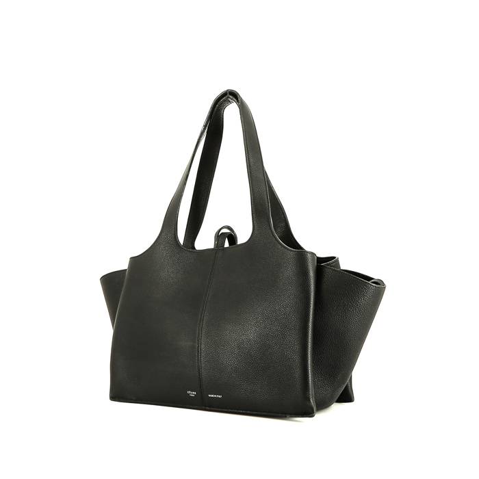 Elegante bolso de mano Celine Tri-Fold de cuero negro, adorno en metal plateado, doble asa de cuero negro para llevar en la mano o al hombro.