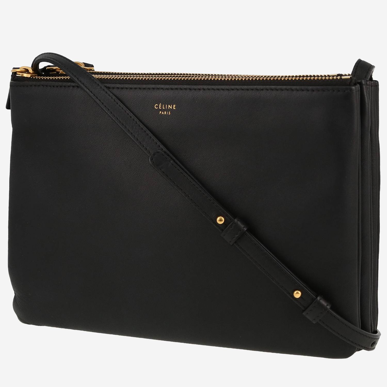 Inconfundible bolso bandolera Celine Trio de cuero negro, adorno en metal dorado, bandolera ajustable de cuero negro para llevar en la mano o colgado al hombro o cruzado.