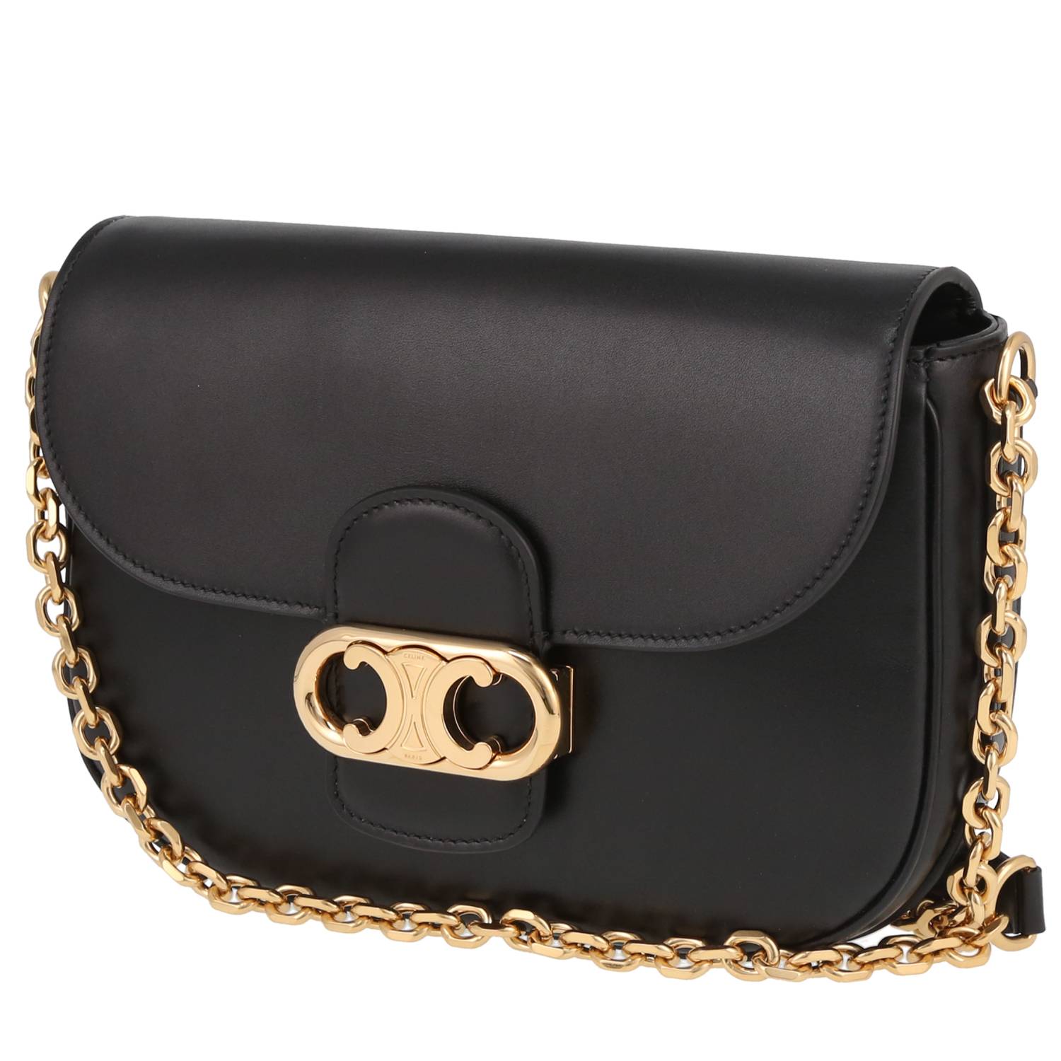 Magnífico bolso de mano Celine Triomphe de cuero negro, adorno en metal dorado, una asa en cadena de metal dorado para llevar en la mano o al hombro.