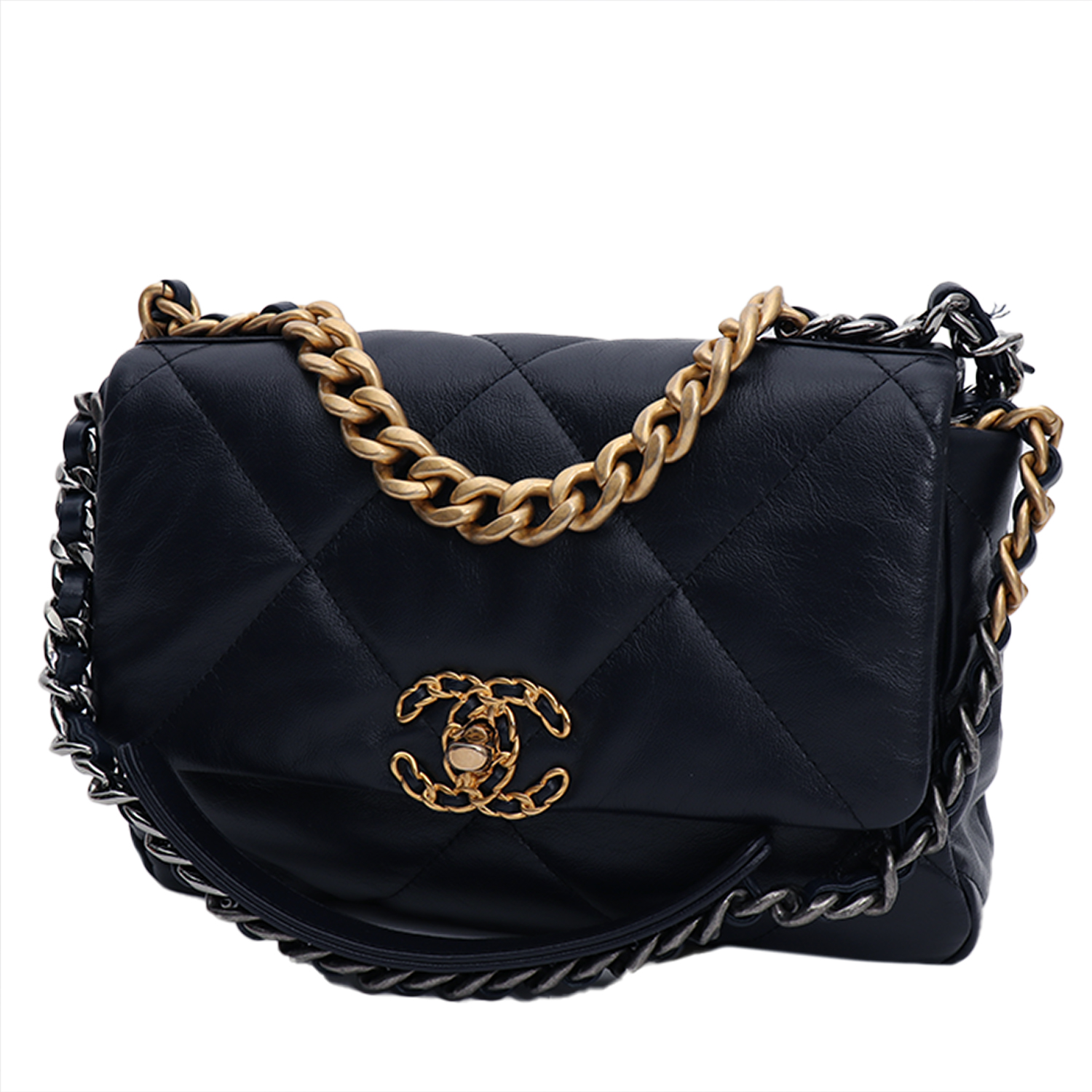 Inconfundible bolso bandolera Chanel 19 de cuero acolchado azul marino, adorno en metal dorado y plateado, asa de metal dorado, una asa en cadena de metal dorado y plateado entrelazada de cuero azul marino para llevar en la mano o colgado al hombro o cruzado.