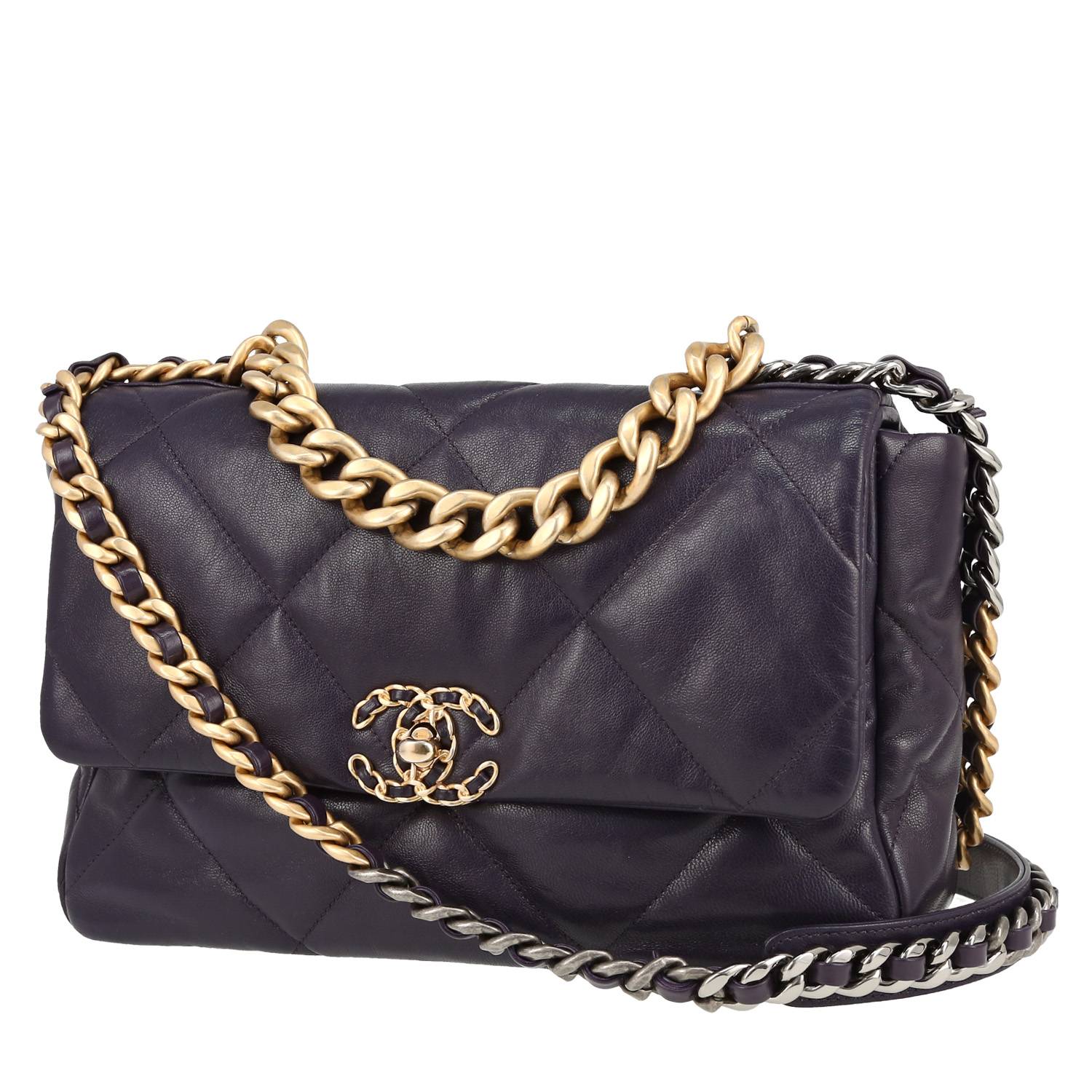 Magnífico bolso bandolera Chanel 19 de cuero acolchado color berenjena, adorno en metal dorado y plateado, asa de metal dorado, una asa en cadena de metal dorado y plateado entrelazada de cuero color berenjena para llevar en la mano o colgado al hombro o cruzado.