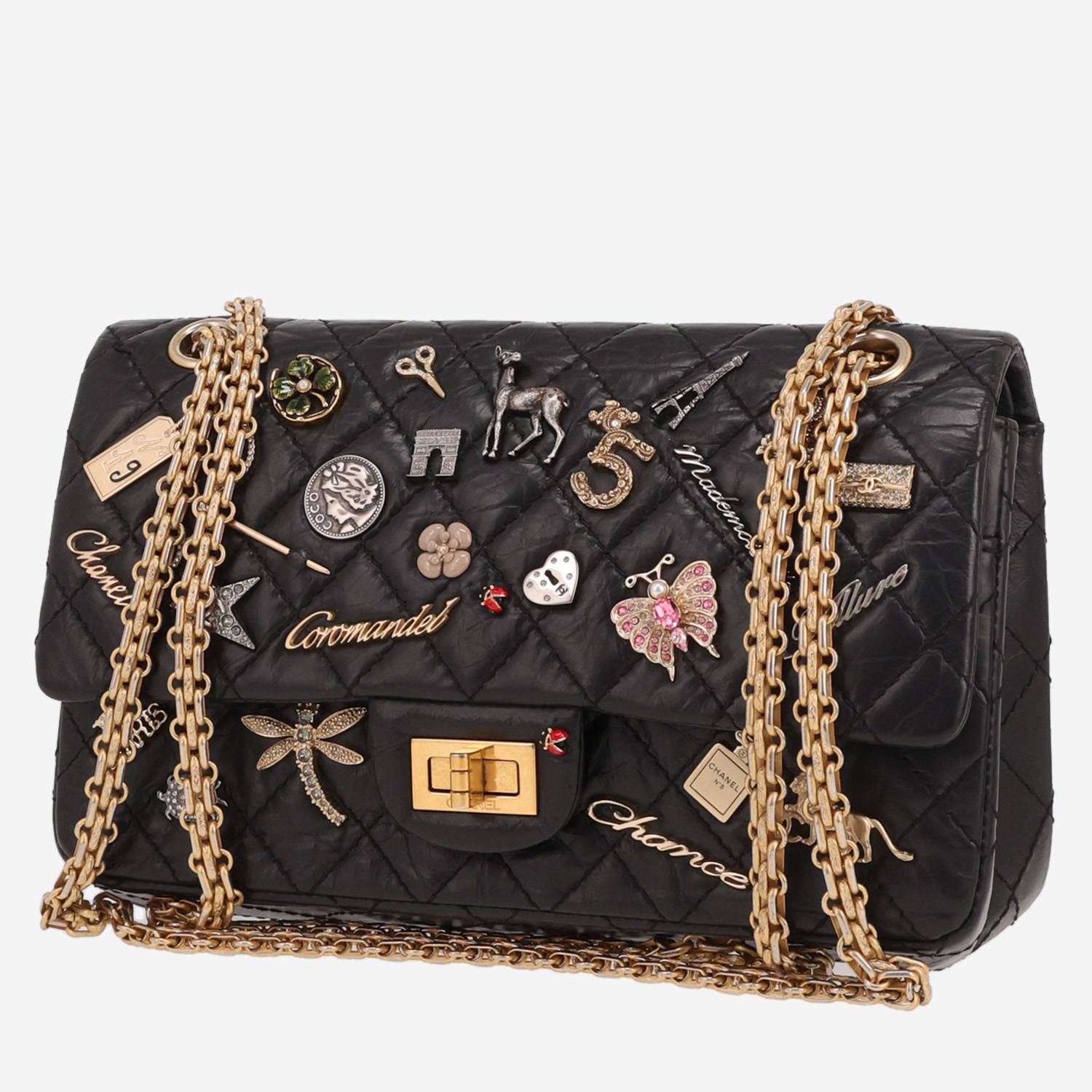 Magnífico bolso de mano Chanel 2.55 de cuero acolchado negro estampado, adorno en metal dorado, una asa en cadena ajustable de metal dorado para llevar en la mano o colgado al hombro o cruzado.