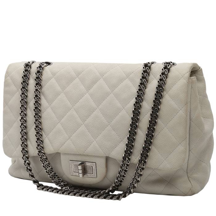Bolso de mano Chanel Chanel 2.55 de cuero granulado acolchado blanco estampado, adorno en metal plateado, una asa en cadena ajustable de metal plateado para llevar en la mano o al hombro.