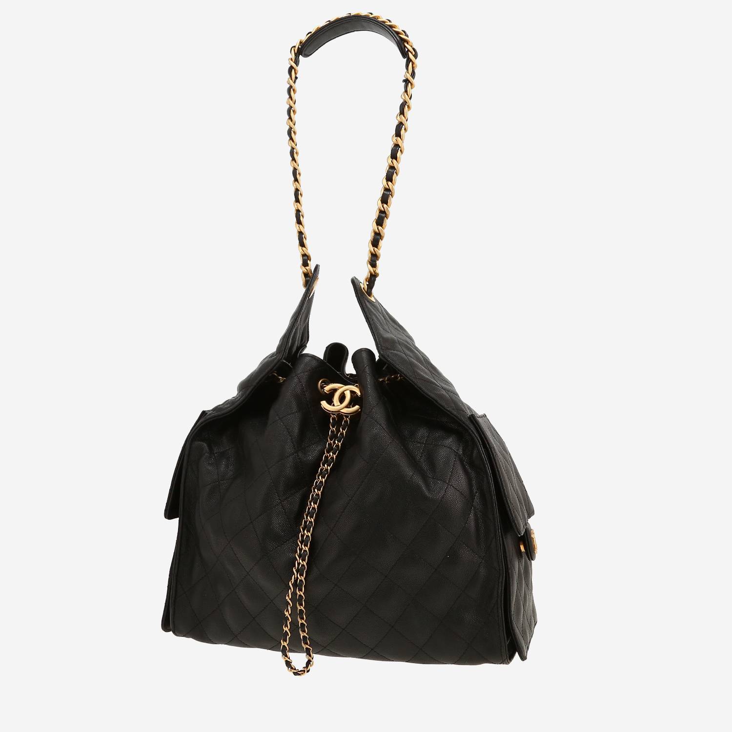 Bonito y codiciado bolso bandolera Chanel 25 de cuero granulado negro, adorno en metal dorado, asa de metal dorado entrelazada de cuero negro para llevar en la mano o al hombro.