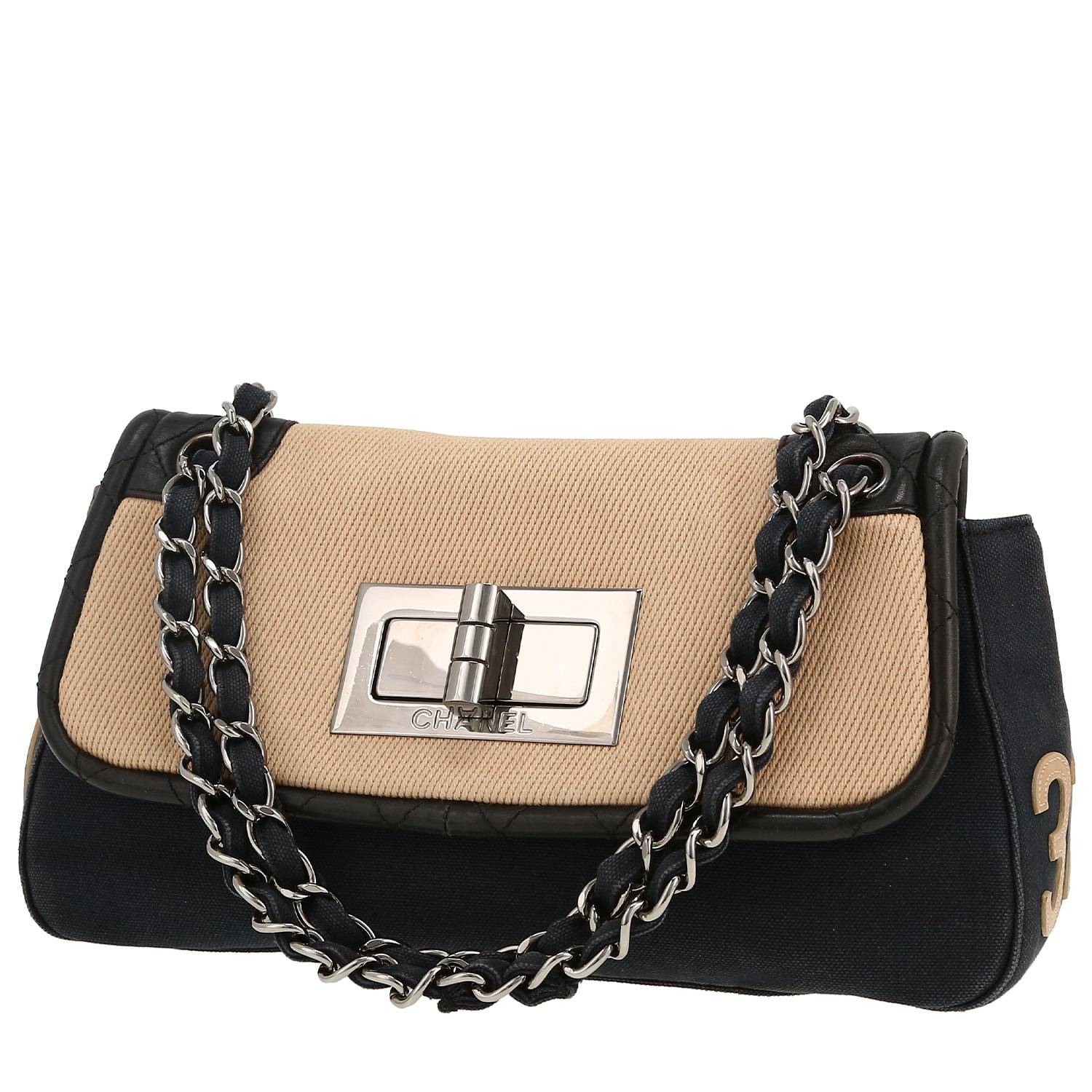 Encantador bolso de mano Chanel Baguette de lona denim azul marino y beige y cuero negro, asa en cadena entrelazada de cuero negro para llevar en la mano o al hombro.