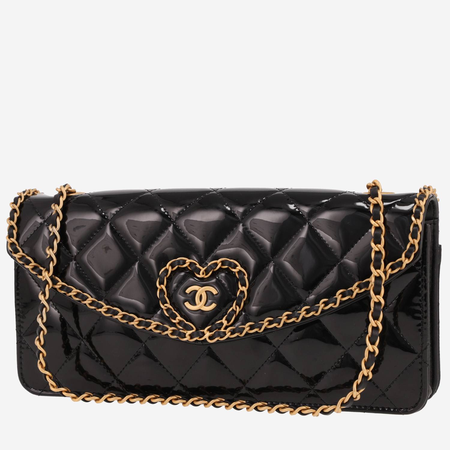 Encantador bolso de mano Chanel de charol acolchado negro, adorno en metal dorado, una asa de metal dorado entrelazada de cuero negro para llevar en la mano o al hombro.
