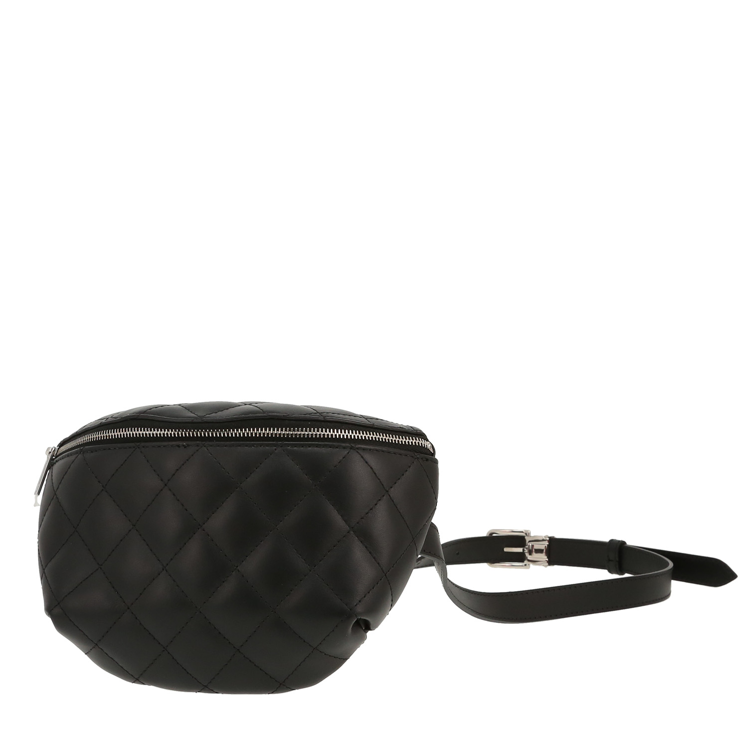 Práctico bolsito-cinturón Chanel de cuero acolchado negro, adorno en metal plateado, una asa ajustable de cuero negro para para ajustar el bolso en la cintura.
