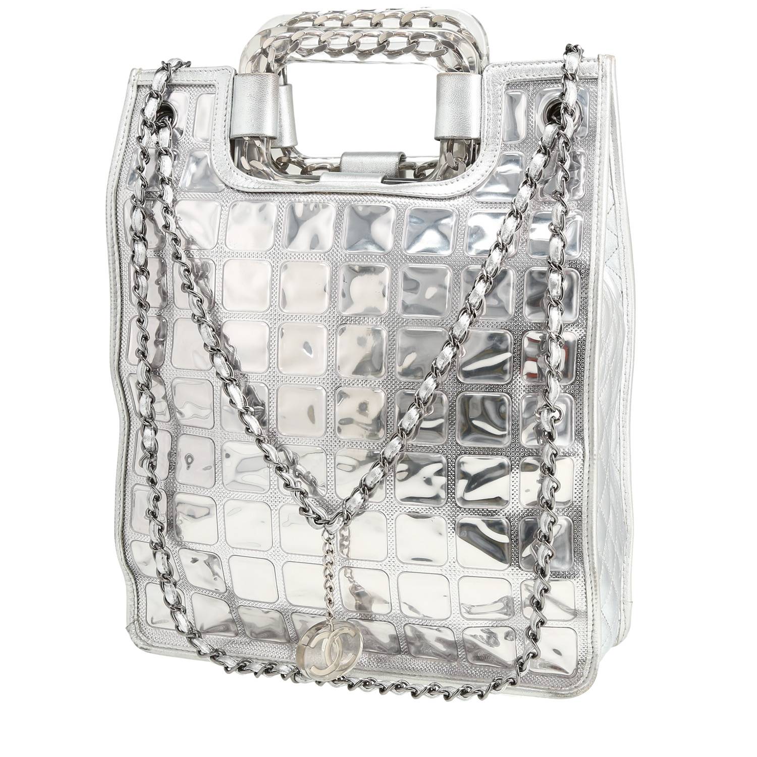 Encantador bolso Cabás Chanel de cuero plateado, adorno en metal plateado, doble asa de cuero plateado, doble asa en cadena de metal plateado entrelazada de cuero plateado para llevar en la mano o al hombro.