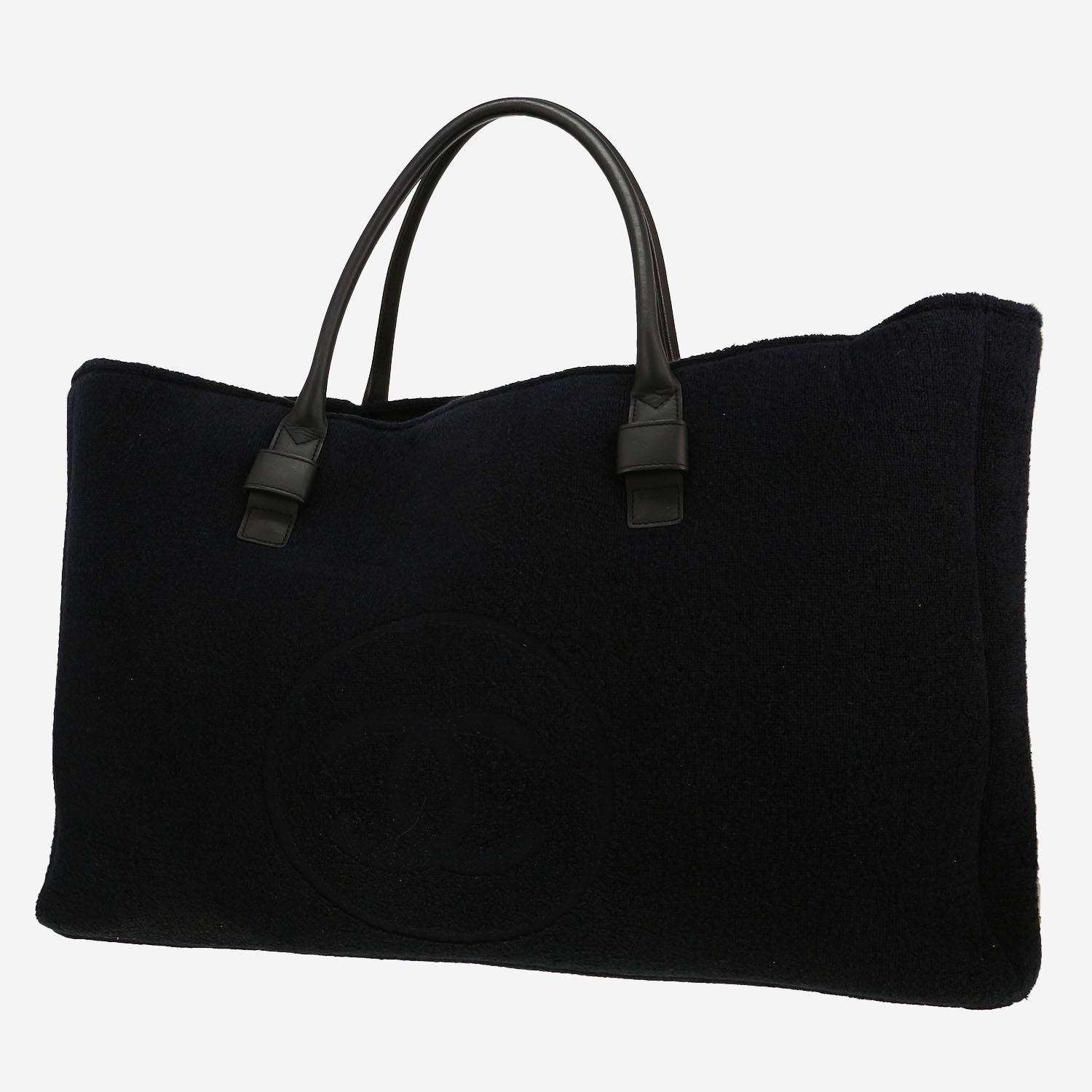 Práctico bolso Cabás Chanel de tejido esponjoso negro, adorno en metal plateado negro, doble asa de cuero negro para llevar en la mano.