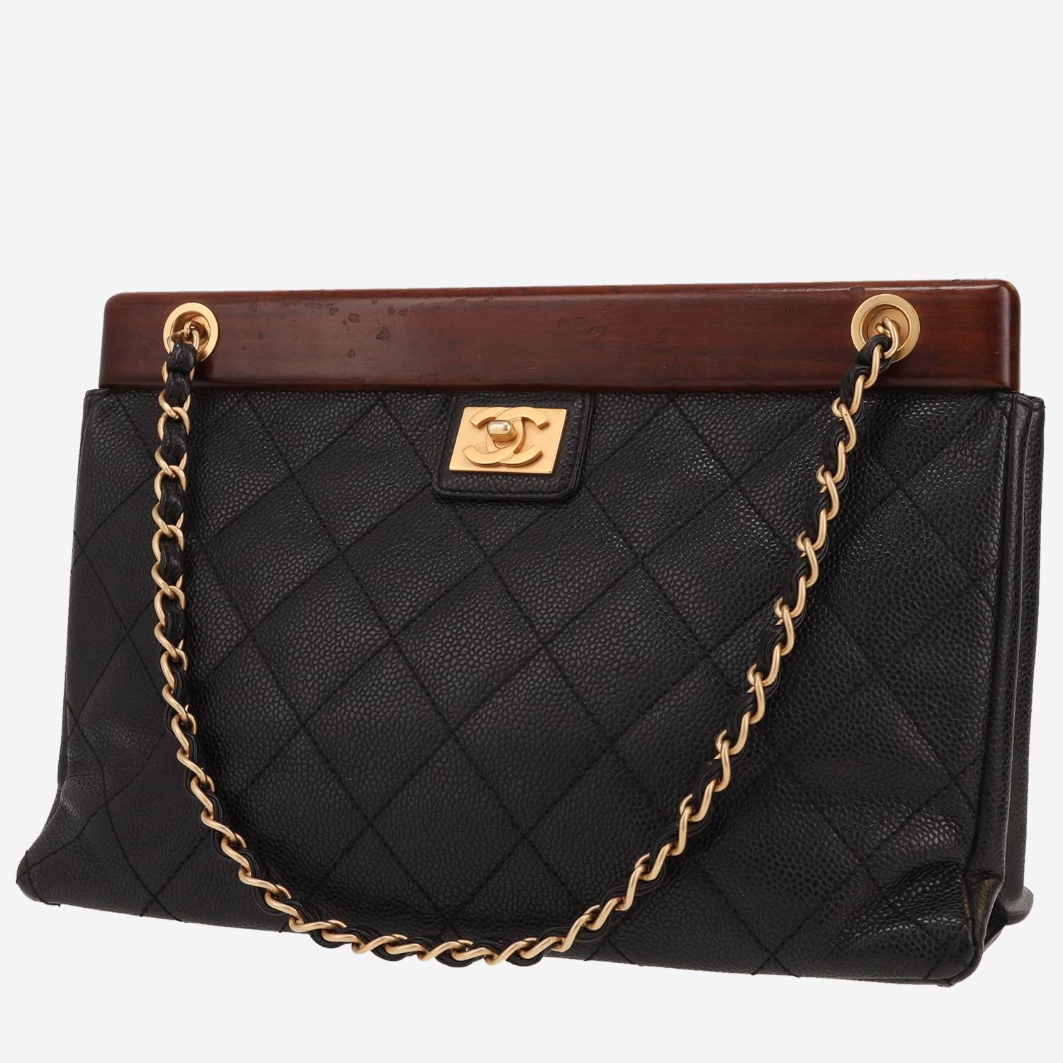 Divertido bolso de mano Chanel de cuero granulado acolchado negro, adorno en metal dorado, doble asa en cadena de metal dorado entrelazada de cuero negro para llevar en la mano o al hombro.