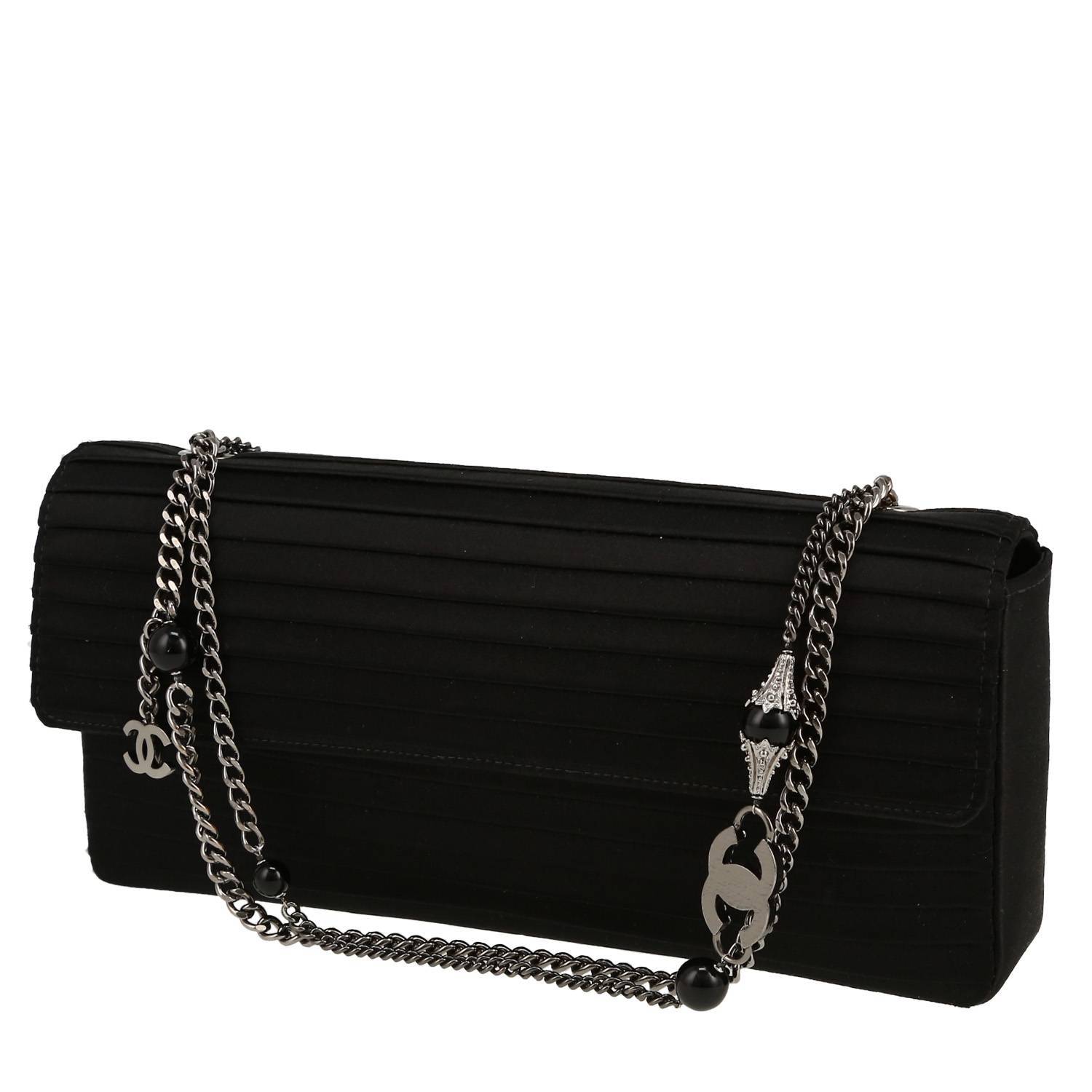 Magnífico bolso de mano Chanel de satén negro, adorno en metal plateado, una asa en cadena de metal plateado para llevar en la mano o al hombro.