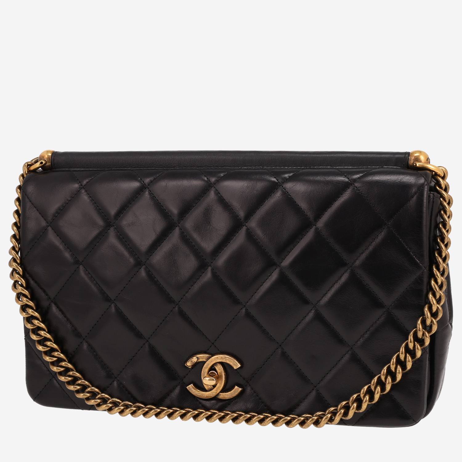 Encantador bolso para llevar al hombro Chanel de cuero acolchado negro, adorno en metal dorado, una asa en cadena de metal dorado para llevar en la mano o al hombro.