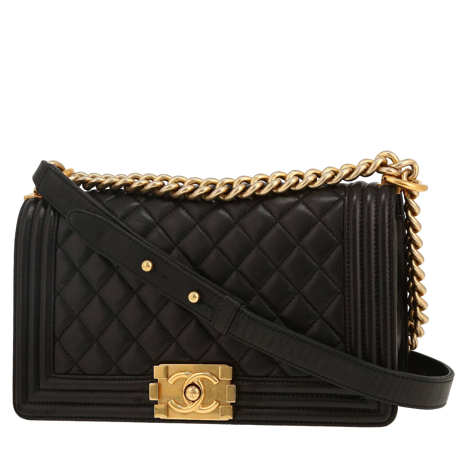 Magnífico bolso bandolera Chanel Boy de cuero acolchado negro, adorno en metal dorado, una asa en cadena ajustable de metal dorado para llevar al hombro o cruzado.