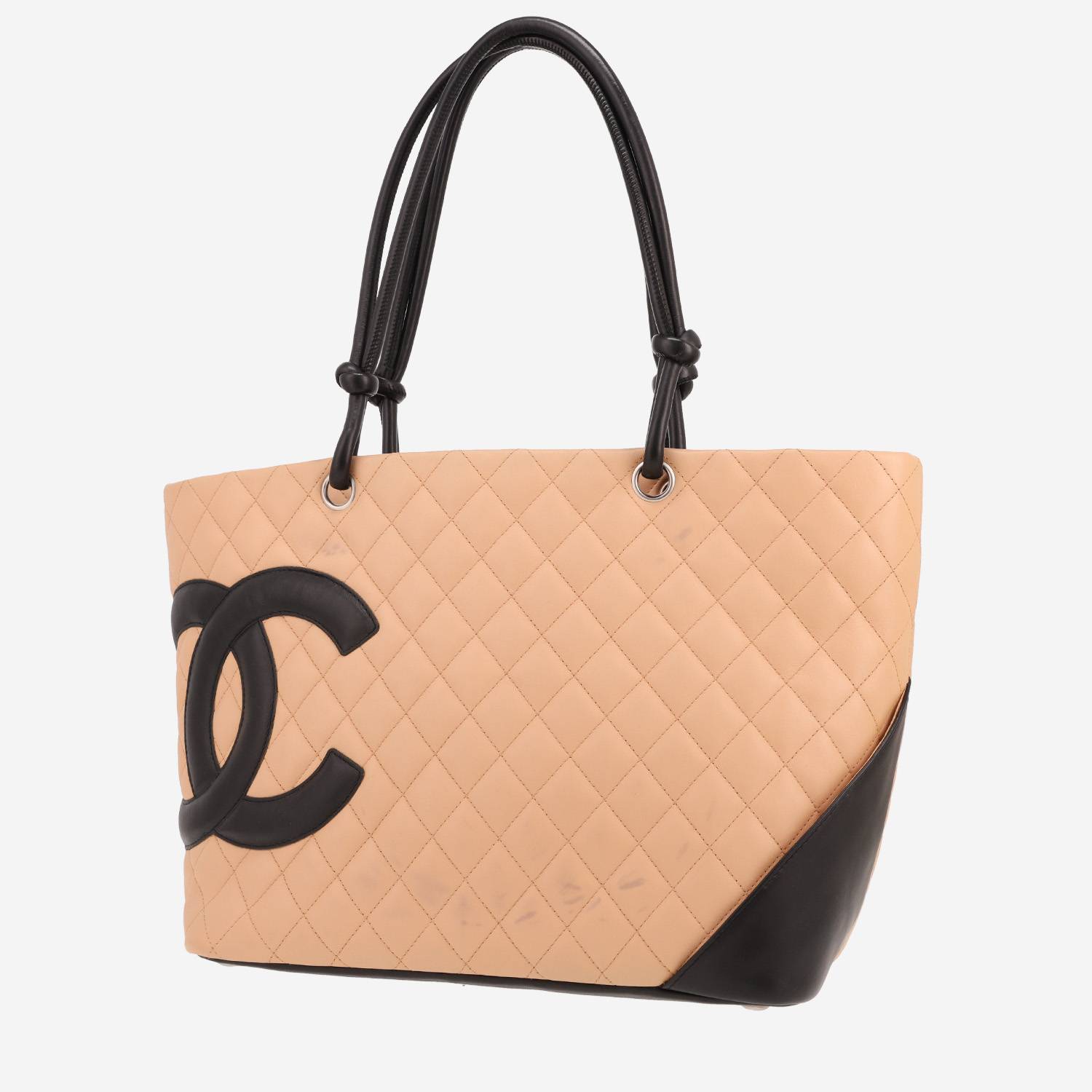 Clásico bolso Cabás Chanel Cambon de cuero acolchado beige y negro, adorno en metal plateado, doble asa de cuero negro para llevar en la mano o al hombro.