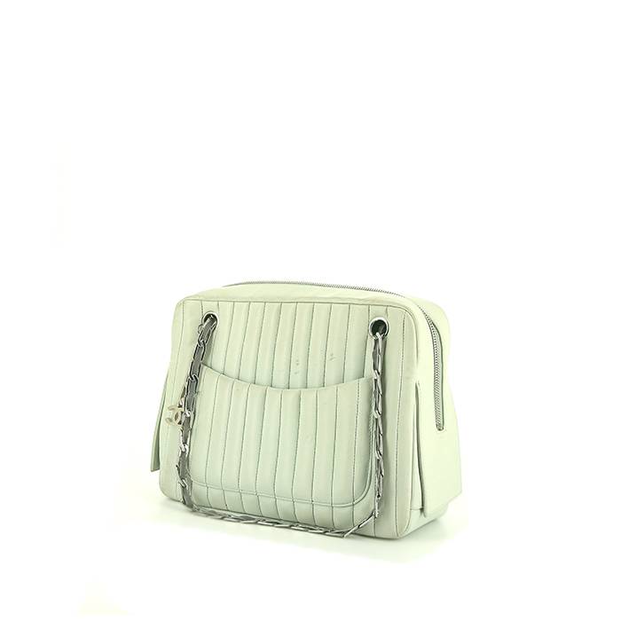 Magnífico bolso de mano Chanel Camera de cuero acolchado verde agua, adorno en metal plateado, asa en cadena de metal plateado entrelazada de lona gris para llevar en la mano o al hombro.
