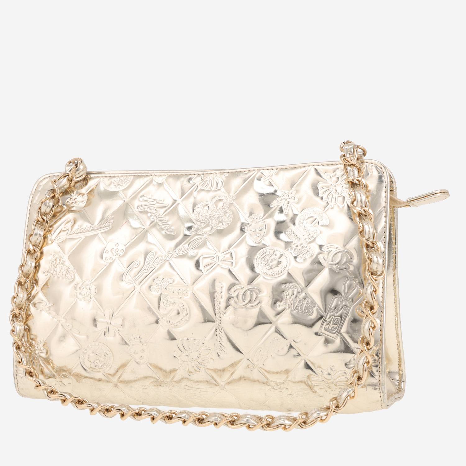 Excepcional bolso de mano Chanel Chance N°5 de charol acolchado dorado estampado, adorno en metal dorado, una asa en cadena de metal dorado entrelazada de charol dorado para llevar en la mano o al hombro.