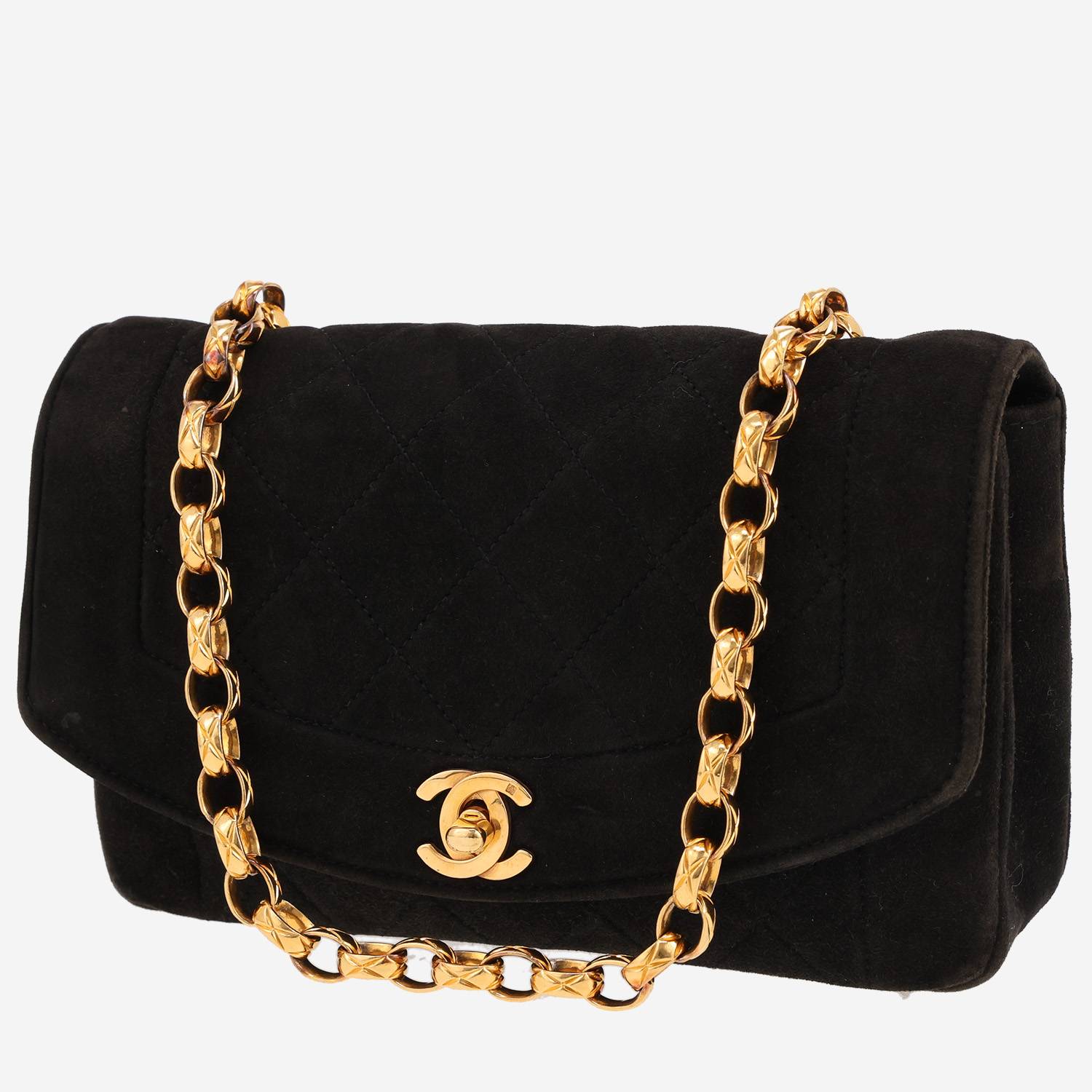 Magnífico bolso bandolera Chanel Diana de Veau velours negro, adorno en metal dorado, una asa en cadena de metal dorado para llevar al hombro o cruzado.