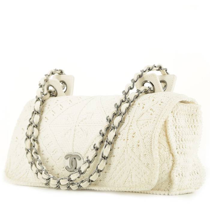Encantador bolso para llevar al hombro o en la mano Chanel Editions Limitées de lona blanco, adorno en metal plateado, doble asa en cadena ajustable de metal plateado entrelazada de cuero blanco para llevar en la mano o al hombro.