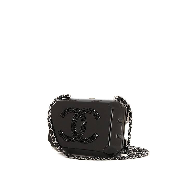 Encantadora caja de joyas Chanel Editions Limitées de plexiglás negro, adorno en metal plateado, una asa en cadena de metal plateado entrelazada de cuero negro para llevar al hombro o cruzado.