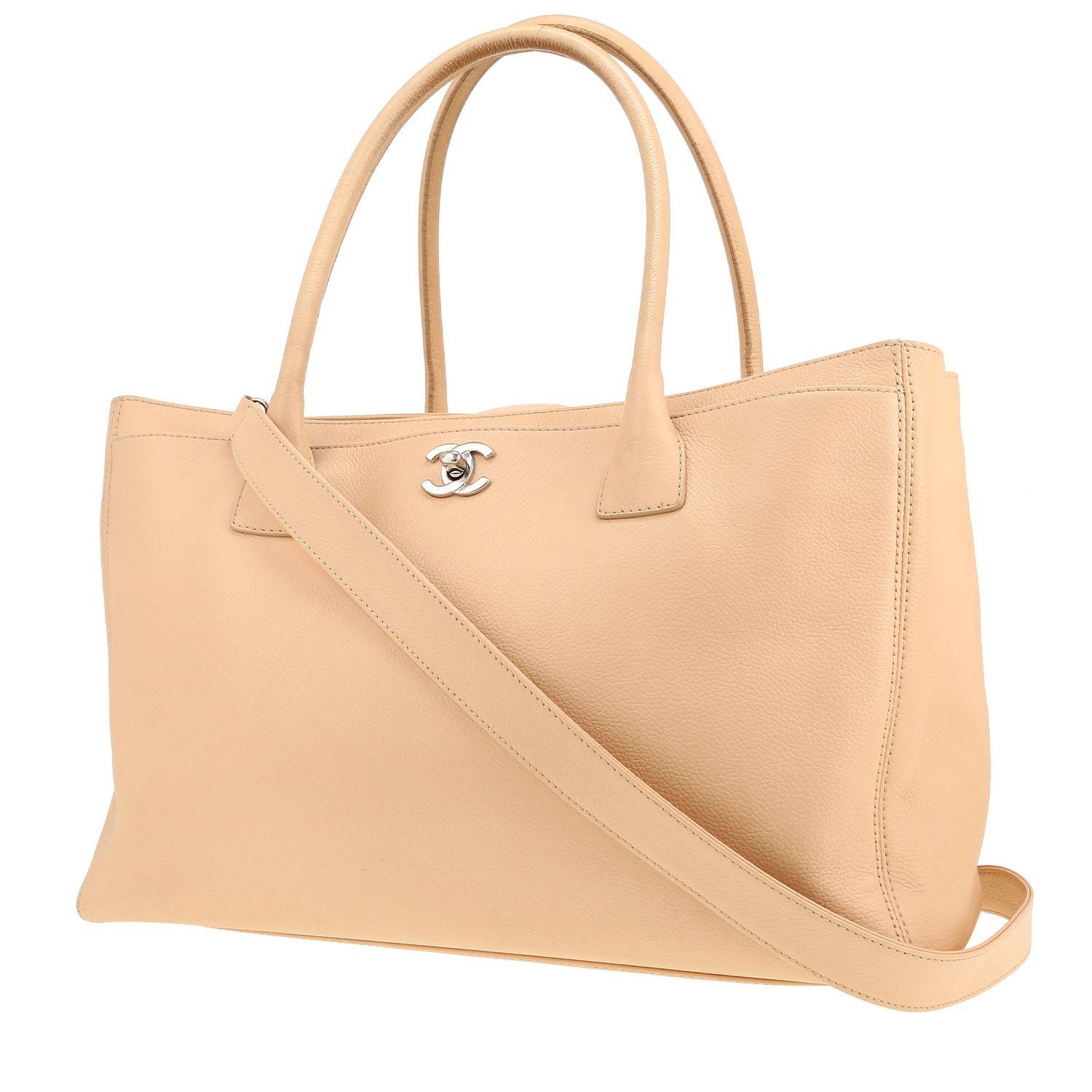 Encantador bolso de mano Chanel Executive de cuero granulado beige, adorno en metal plateado, doble asa de cuero granulado beige, una bandolera de cuero beige para llevar en la mano o colgado al hombro o cruzado.