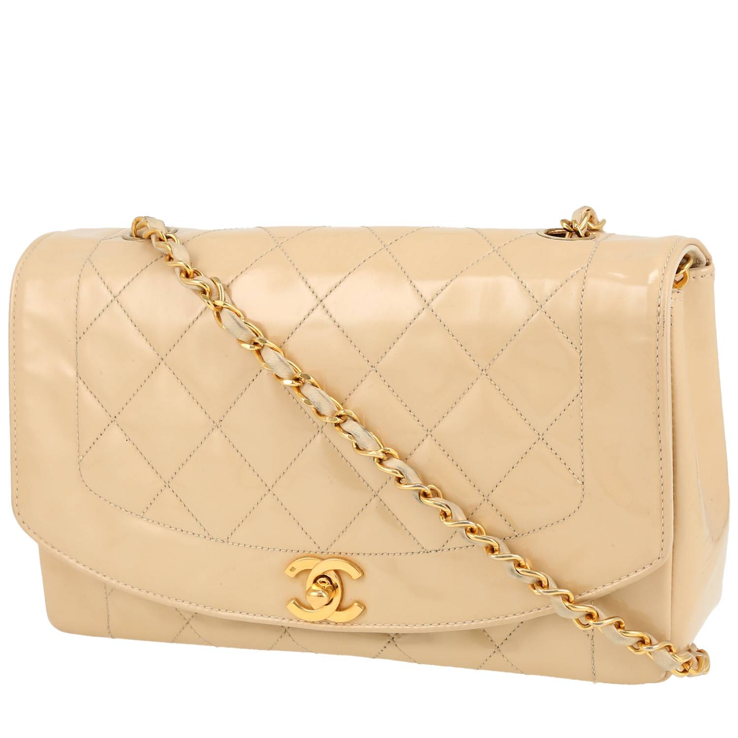 Inconfundible bolso bandolera Chanel Mademoiselle de charol acolchado beige, adorno en metal dorado, una asa en cadena de metal dorado entrelazada de cuero beige para llevar al hombro o cruzado.