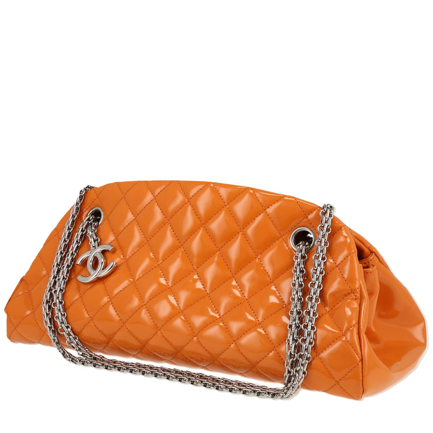 Bonito y original bolso de mano Chanel Mademoiselle de charol acolchado naranja, adorno en metal plateado, una asa en cadena ajustable de metal plateado para llevar en la mano o colgado al hombro o cruzado.