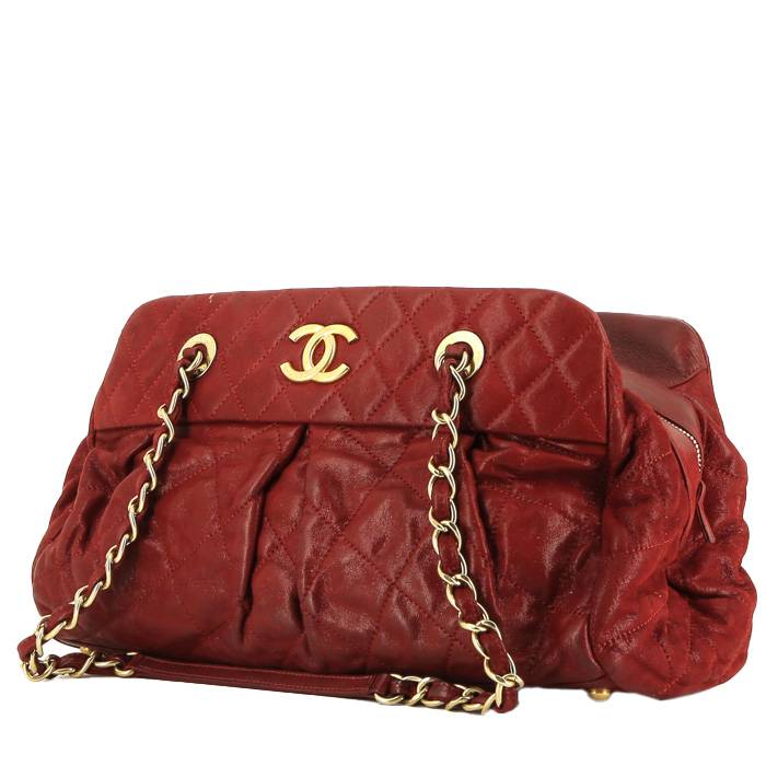 Práctico bolso de mano Chanel Mademoiselle de cuero acolchado rojo, adorno en metal dorado, una asa en cadena de metal dorado entrelazada de cuero rojo para llevar en la mano o al hombro.