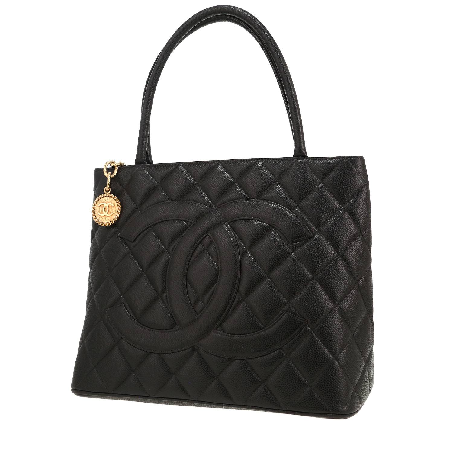 Práctico bolso de mano Chanel Medaillon de cuero granulado acolchado negro, adorno en metal dorado, doble asa de cuero negro para llevar en la mano.