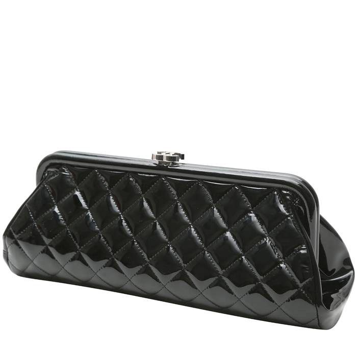 Magnífico bolsito de mano Chanel Pochette de charol acolchado negro, adorno en metal plateado.