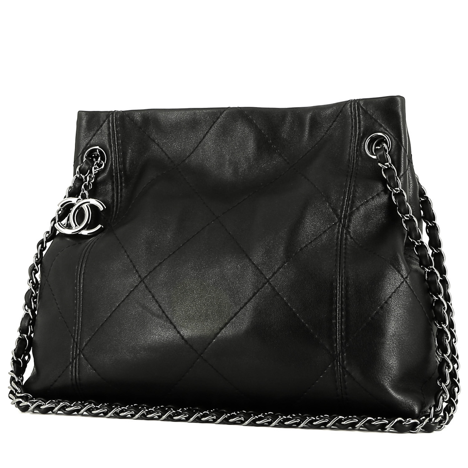 Bonito bolso de mano Chanel Grand Shopping de cuero negro, dos asas de cuero negro entrelazada de metal plateado para llevar en la mano o al hombro.