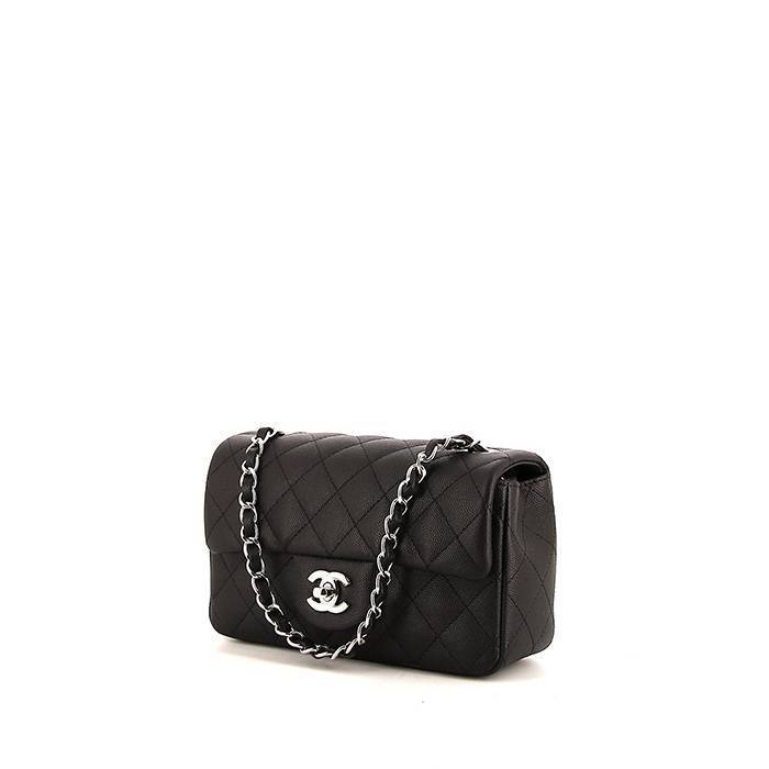 Precioso bolso bandolera Chanel Mini Timeless de cuero granulado acolchado negro, adorno en metal plateado, asa en cadena de metal plateado entrelazada de cuero negro para llevar al hombro o cruzado.