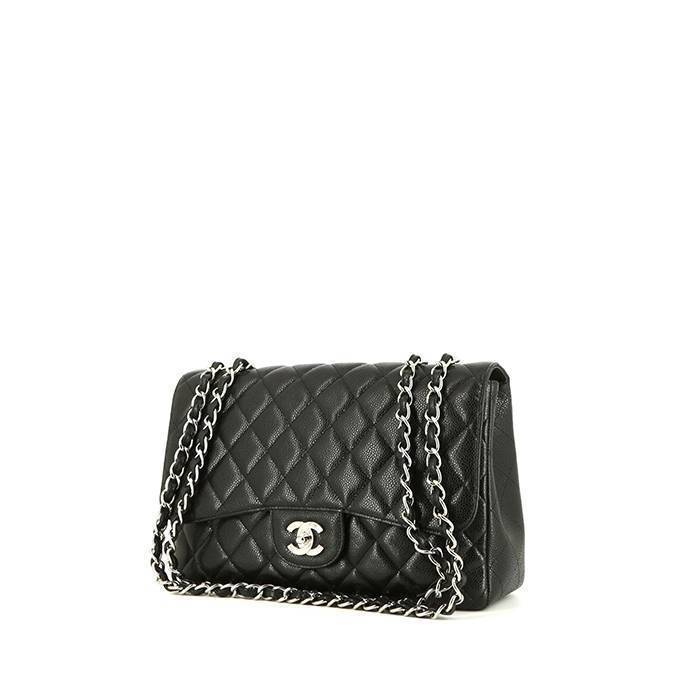 Bonito y codiciado bolso bandolera Chanel Timeless Jumbo de cuero acolchado negro, adorno en metal plateado, asa en cadena de metal plateado entrelazada de cuero negro para llevar en la mano o colgado al hombro o cruzado.