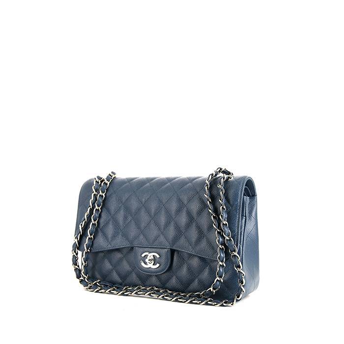 Encantador bolso bandolera Chanel Timeless jumbo de cuero granulado acolchado azul, adorno en metal plateado, asa en cadena de metal plateado entrelazada de cuero azul para llevar en la mano o colgado al hombro o cruzado.
