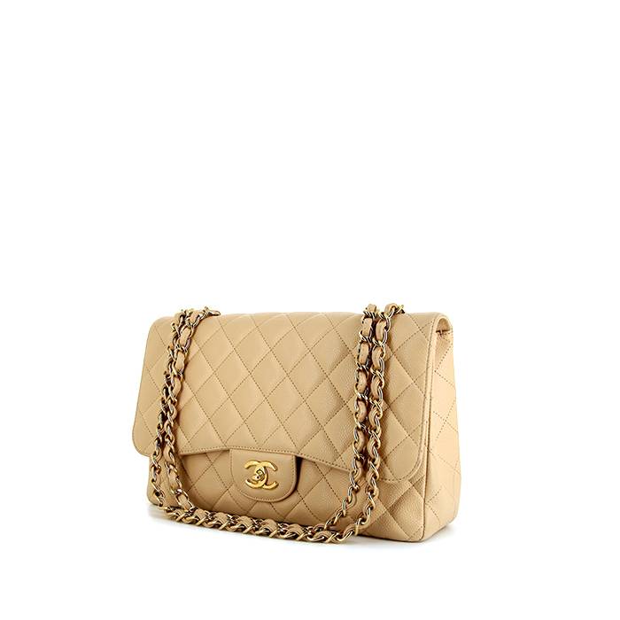 Elegante bolso bandolera Chanel Timeless jumbo de cuero granulado acolchado beige, adorno en metal dorado, asa en cadena de metal dorado entrelazada de cuero beige para llevar en la mano o colgado al hombro o cruzado.