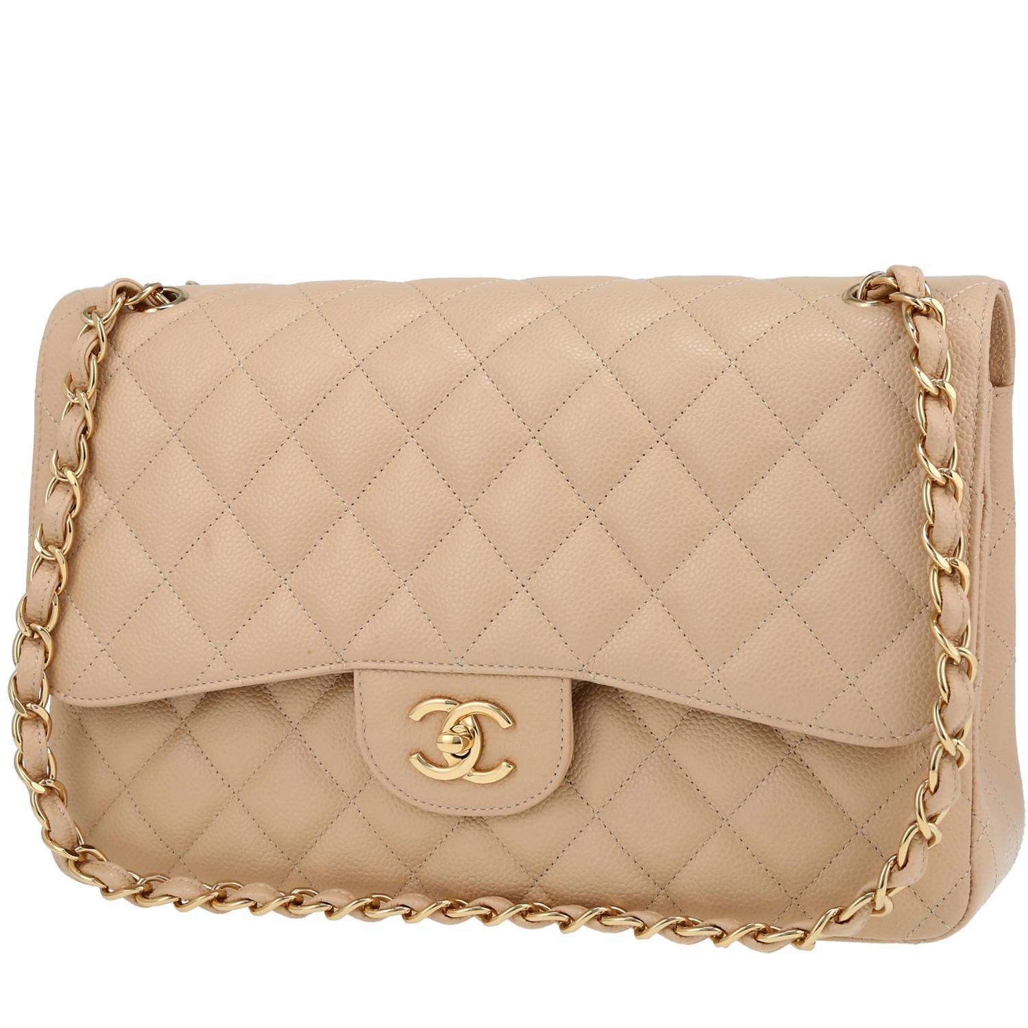 Bonito y codiciado bolso bandolera Chanel Timeless Jumbo de cuero granulado acolchado beige, adorno en metal dorado, asa en cadena de metal plateado entrelazada de cuero negro para llevar en la mano o colgado al hombro o cruzado.