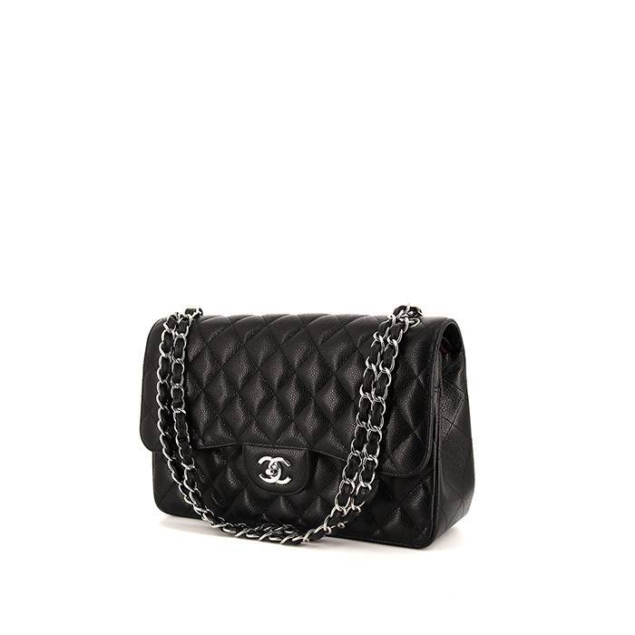 Intemporal bolso bandolera Chanel Timeless jumbo de cuero granulado acolchado negro, adorno en metal plateado, asa en cadena de metal plateado entrelazada de cuero negro para llevar en la mano o colgado al hombro o cruzado.