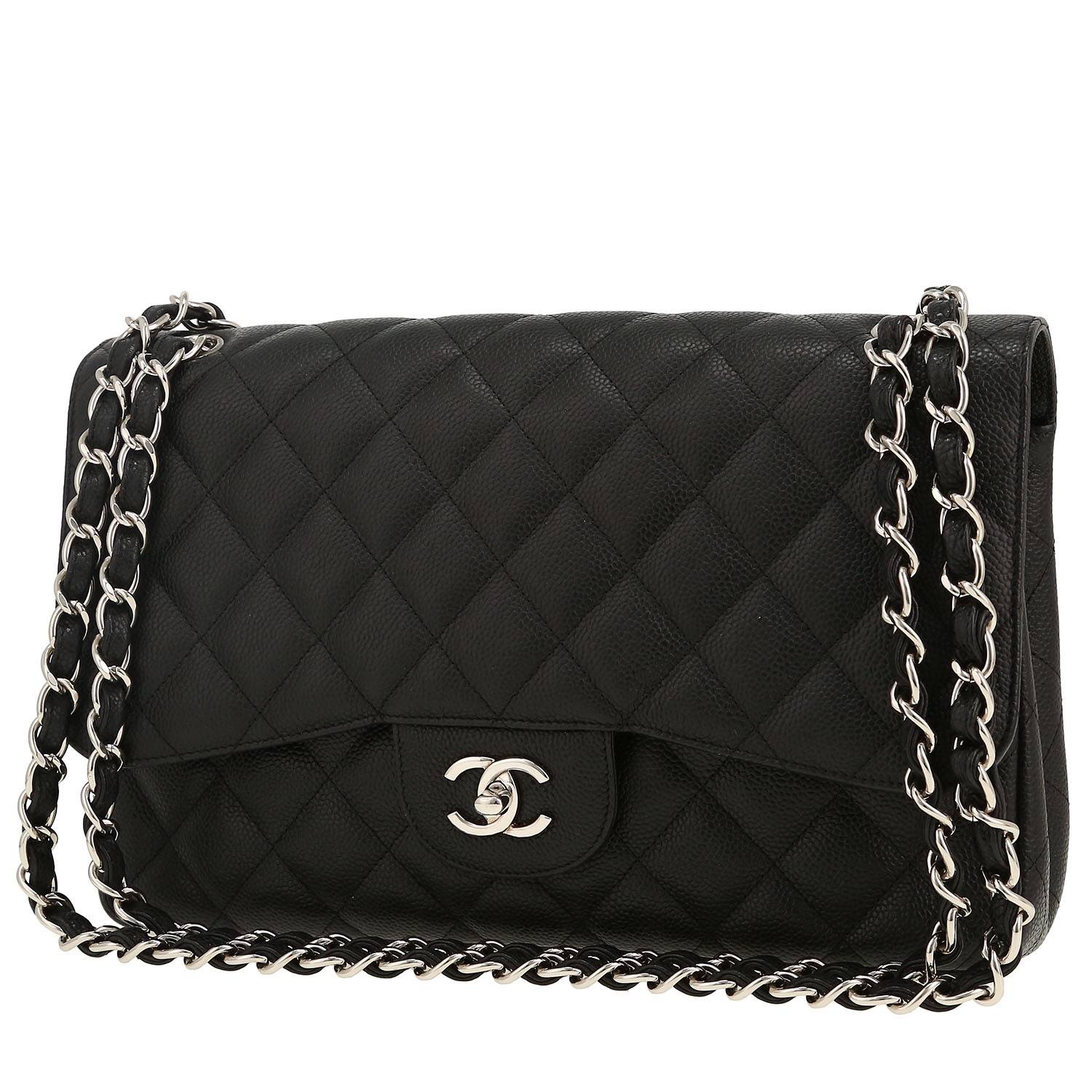 Espléndido bolso bandolera Chanel Timeless Jumbo de cuero granulado acolchado negro, adorno en metal plateado, una asa en cadena de metal plateado entrelazada de cuero negro para llevar en la mano o colgado al hombro o cruzado.