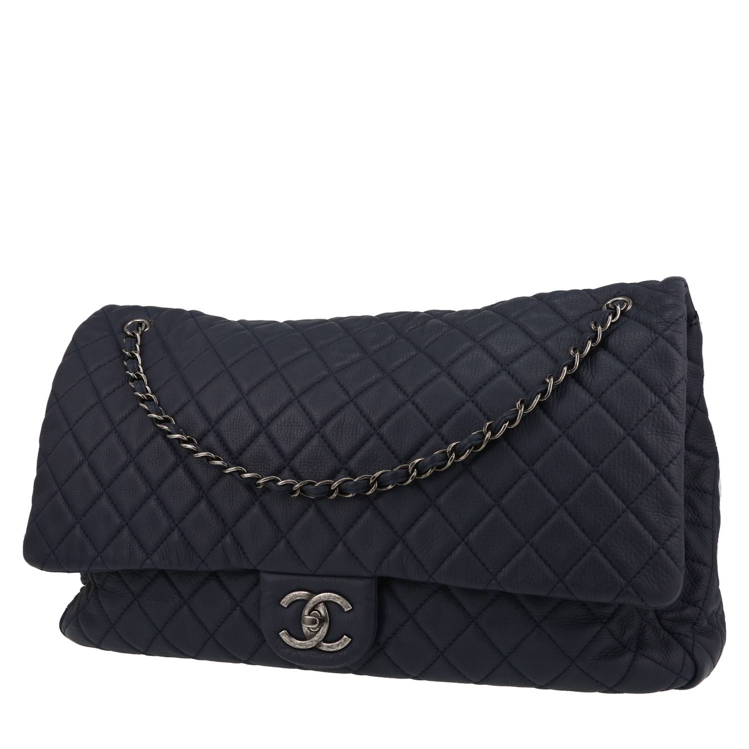 Práctico bolso bandolera Chanel Timeless Maxi Jumbo de cuero acolchado azul, adorno en metal plateado negro, asa en cadena ajustable de metal plateado negro entrelazada de cuero azul para llevar en la mano o colgado al hombro o cruzado.