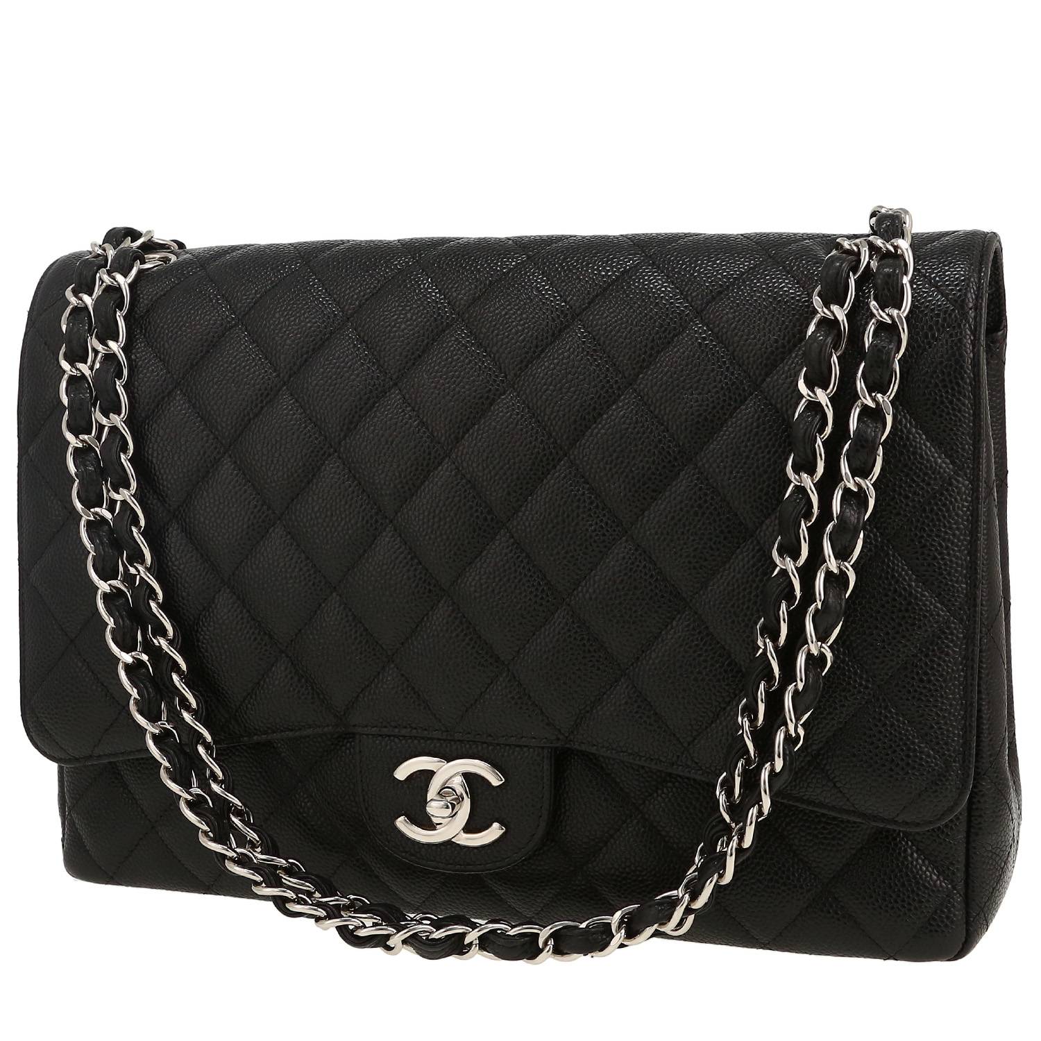 Magnífico bolso bandolera Chanel Timeless Maxi Jumbo de cuero granulado acolchado negro, adorno en metal plateado, una asa en cadena ajustable de metal plateado entrelazada de cuero negro para llevar en la mano o colgado al hombro o cruzado.