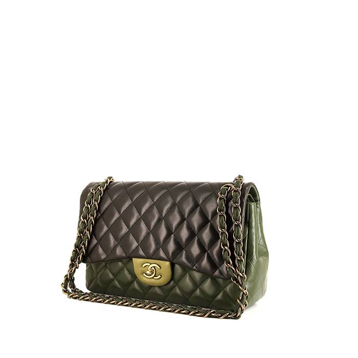 Magnífico bolso de mano Chanel de cuero acolchado tricolor verde aceituna, marrón y verde anís, adorno en metal dorado, una asa ajustable de metal dorado entrelazada de cuero verde aceituna para llevar en la mano o al hombro.