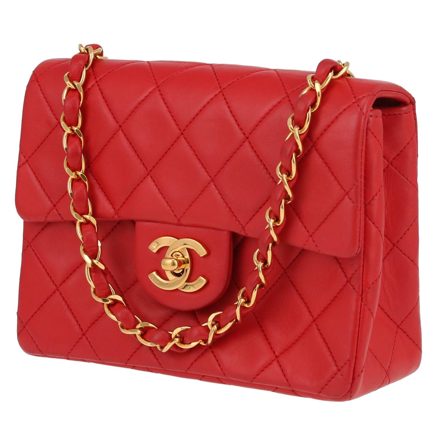 Precioso bolso de mano Chanel Mini Carré de cuero acolchado rojo, adorno en metal dorado, una asa en cadena de metal dorado entrelazada de cuero rojo para llevar al hombro o cruzado.