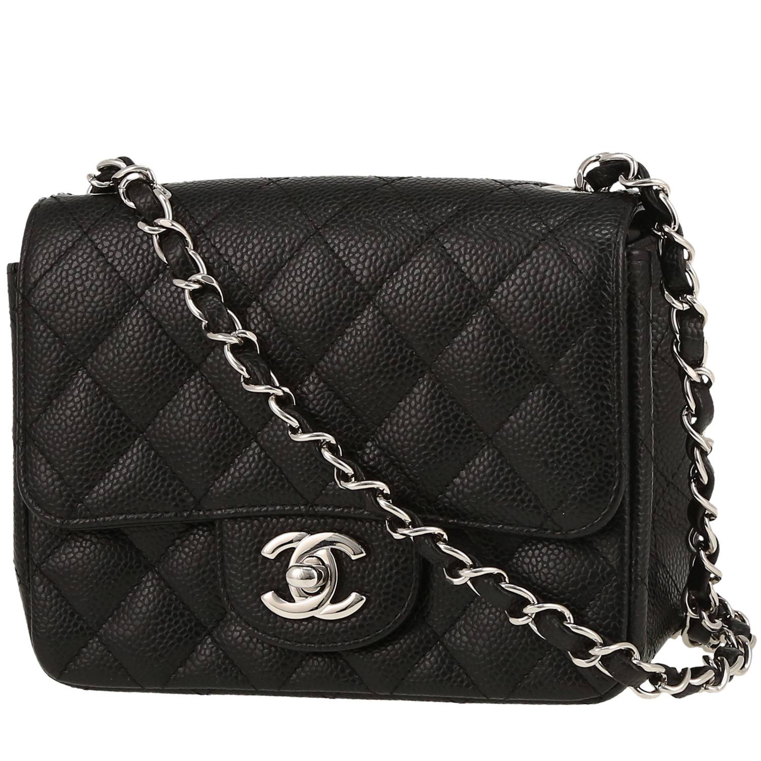 Precioso bolso de mano Chanel Mini Carré de cuero granulado acolchado negro, adorno en metal plateado, una asa en cadena de metal plateado entrelazada de cuero negro para llevar al hombro o cruzado.