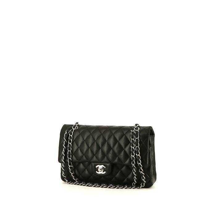 Elegante bolso de mano Chanel Timeless Classic de cuero acolchado negro, adorno en metal plateado, una asa en cadena de metal plateado entrelazada de cuero negro para llevar en la mano o al hombro.