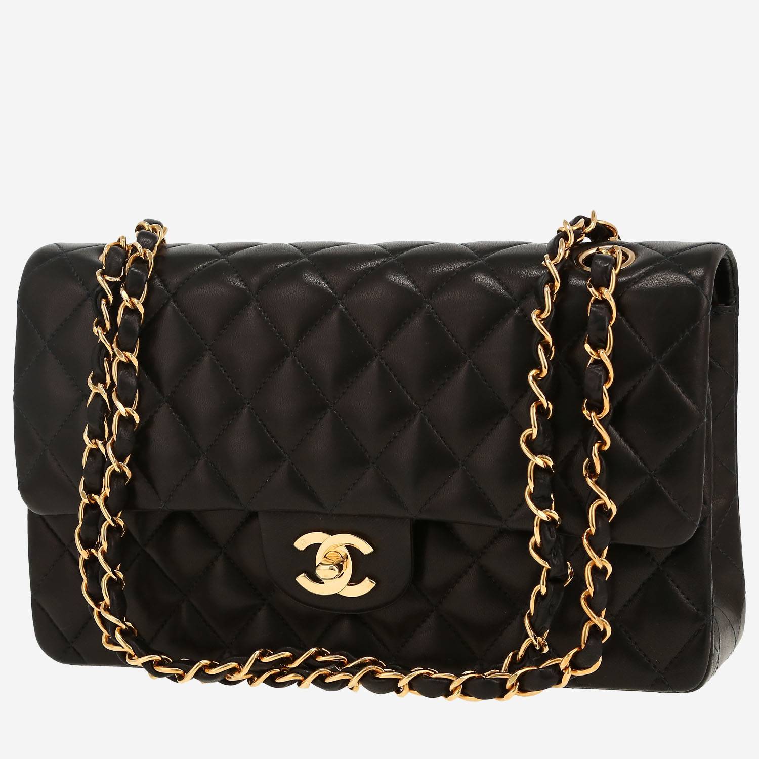 Excepcional bolso de mano Chanel Timeless Classic de cuero acolchado negro, adorno en metal dorado, una asa en cadena de metal dorado entrelazada de cuero negro para llevar en la mano o al hombro.