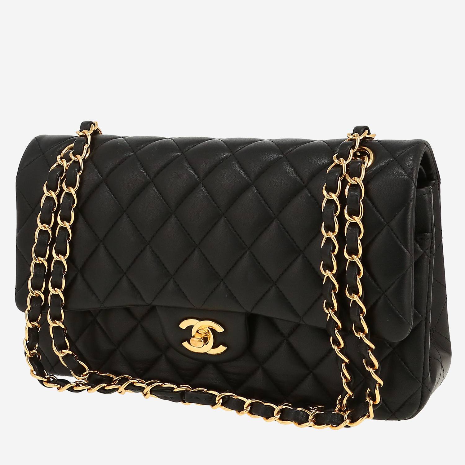 Magnífico bolso de mano Chanel Timeless Classic de cuero acolchado negro, adorno en metal dorado, una asa en cadena ajustable de metal dorado entrelazada de cuero negro para llevar en la mano o al hombro.