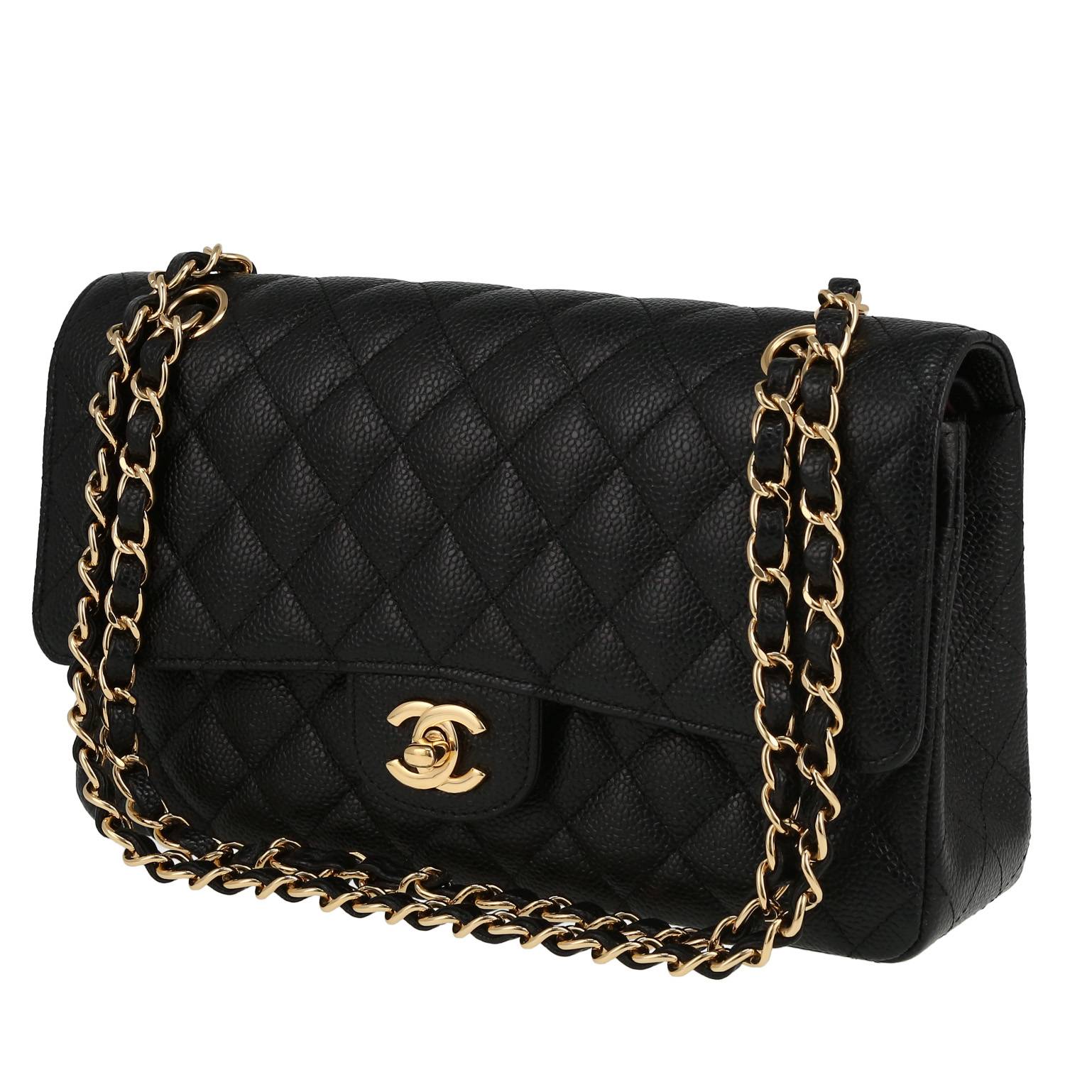 Magnífico bolso de mano Chanel Timeless Classic de cuero granulado acolchado negro, adorno en metal dorado, asa en cadena de metal dorado entrelazada de cuero negro para llevar en la mano o al hombro.